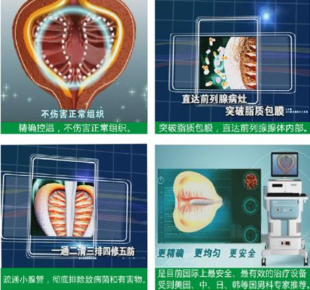 “第三代智源肽场效治疗系统”腔内场效消融系统利用高频高能聚焦电流场产生的能量,促使组织细胞内离子移动,产生生物效应,对前列腺炎有直达病灶,高效杀菌,畅通腺管,排除毒素,促进腺体功能恢复,达到消炎止痛,组织再生修复的效果。它是目前治疗各种细菌性前列腺炎,以及细菌性前列腺炎合并支原体、衣原体、淋菌性尿道炎等尿道感染理想的治疗方法。
