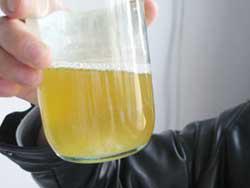 图为多泡沫的尿液,图中尿液有泛黄的表现,与不泛黄的病因会有所差别