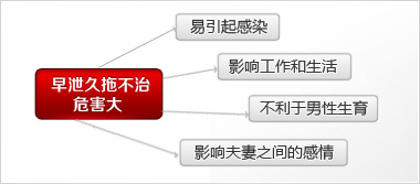 (1)对精神因素的影响。精神不振,影响工作是早泄的危害的主要表现,通常有口苦咽干、小便黄赤、淋浊、阴痒,舌质红,苔黄,脉弦数,并会长期伴有精神不振,神疲倦怠,夜寐不安,精薄清冷,心悸不宁等,影响工作和生活。