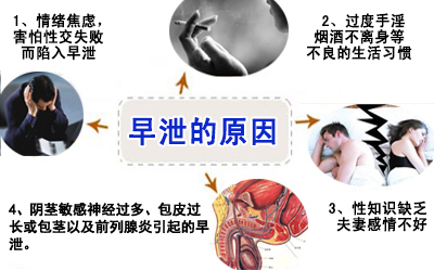 3)手淫恶习:许多男性有频繁手淫的习惯,而且在手淫的时候害怕被人发现,心情紧张,力求快速射精,逐渐养成早泄的习惯。